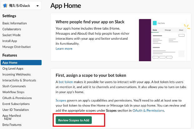 OAuth & Permissionsの赤枠のAdd an OAuth Scopeをクリック
