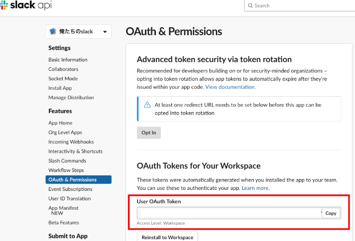 トークンは設定画面のOAuth & Permissionsにあります。左メニューからいけます。