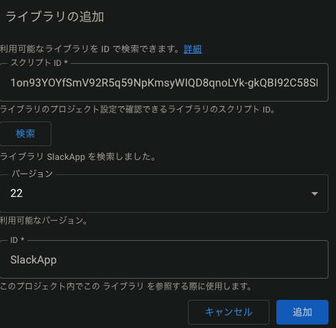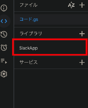 SlackAppはライブラリにありまして、自分のGoogle Apps Scriptエディタで利用するには追加しないといけません。