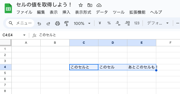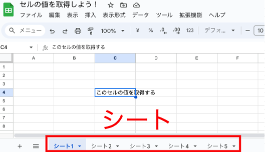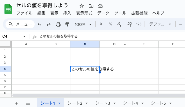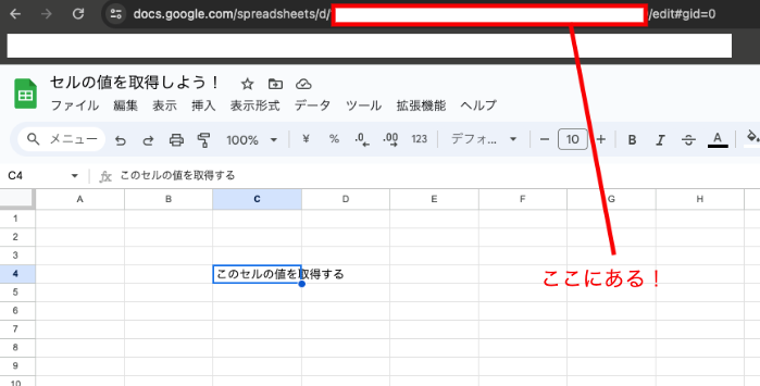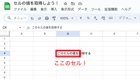 下のスプレッドシートのC4のセルにある「このセルの値を取得する」を取得します。