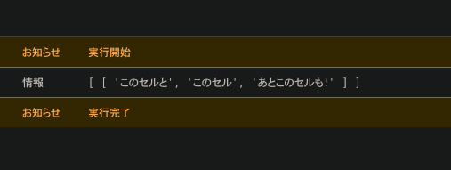 出力結果は入れ子の配列です。つまり、getValuesの返り値は入れ子の配列(2次元配列)になるんですね。