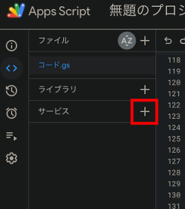 エディタ画面のメニューにあるサービスの+ボタンをクリック