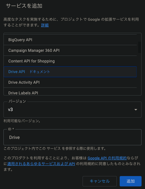 DriveAPIを追加(バージョンはV3)
