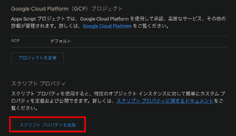 プロジェクトの設定画面下のスクリプトプロパティからスクリプト プロパティを追加をクリック