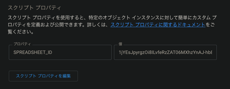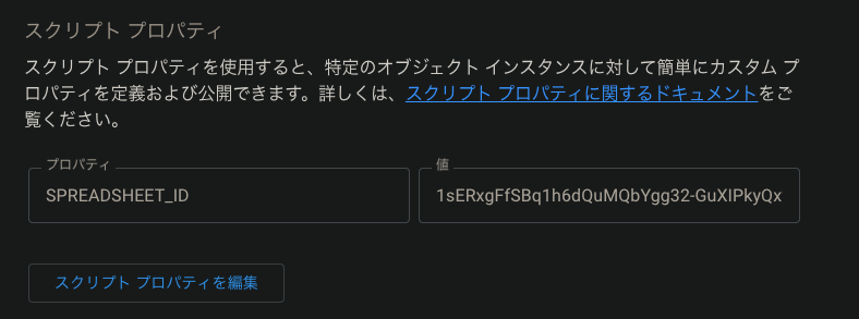 これでさきほど設定したスプレッドシートIDの値を取り出せます。