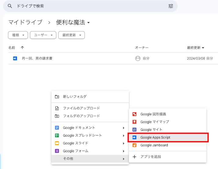どのフォルダでもいいので右クリックでメニューをひらいてGoogle Apps Scriptをクリックします