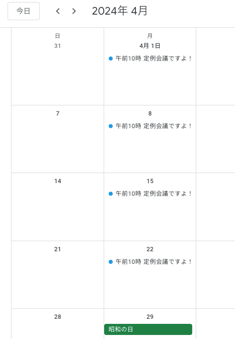 カレンダーに定例会議の予定が入りましたし、議事録はつくれましたし、議事録の本文の修正もできました。