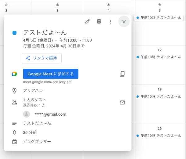 この場合は説明に「テストだよ~ん」、場所に「アリアハン」、ゲストに「*****@gmail.com」、送信メールを「送る」設定にしています。