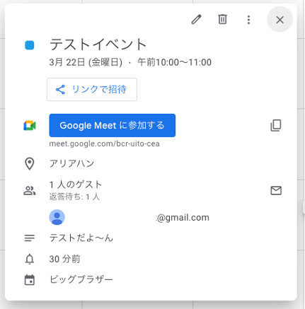 この場合は説明に「テストだよ~ん」、場所に「アリアハン」、ゲストに「*****@gmail.com」、送信メールを「送る」設定にしています。