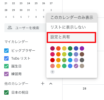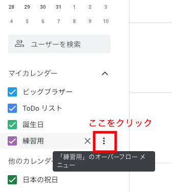 次は、今つくった「練習用」カレンダーを取得します。