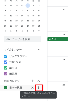 「日本の祝日」にマウスカーソルをあわせて「・・・」メニューをクリック