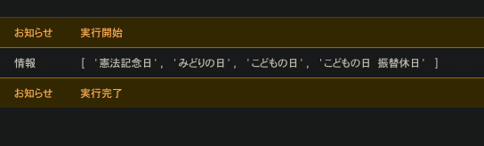 今回の記事の目的からは外れますが、取得した祝日のカレンダーから祝日の名称を取得してみます。